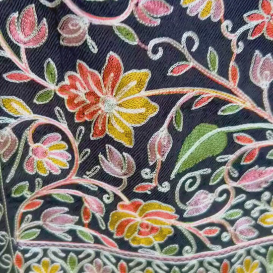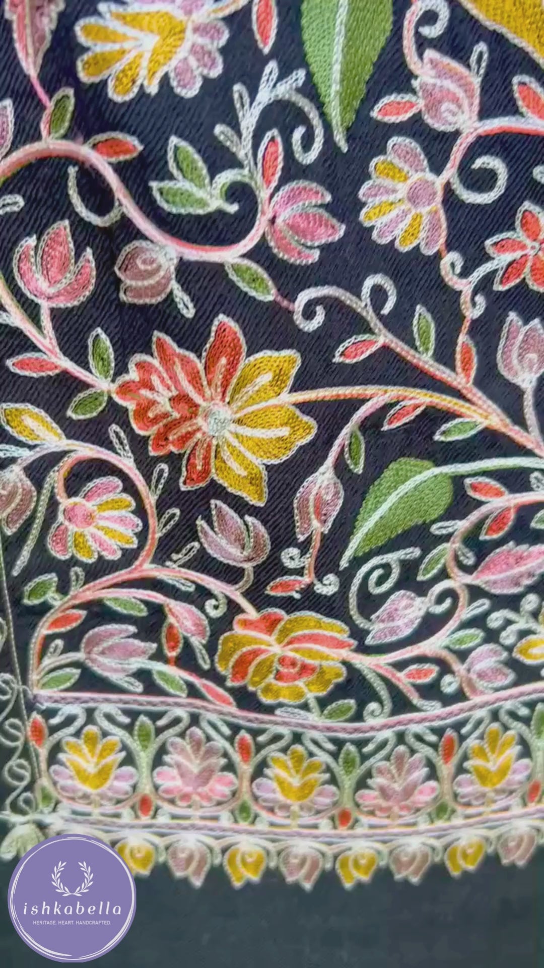 Bold, warm, and luxurious—this black Cashmere Pashmina stole features stunning Ari embroidery in orange and yellow hues, creating a captivating contrast. The delicate floral motifs illuminate the dark base, showcasing the artistry and precision of traditional Kashmiri hand embroidery.