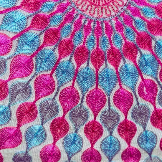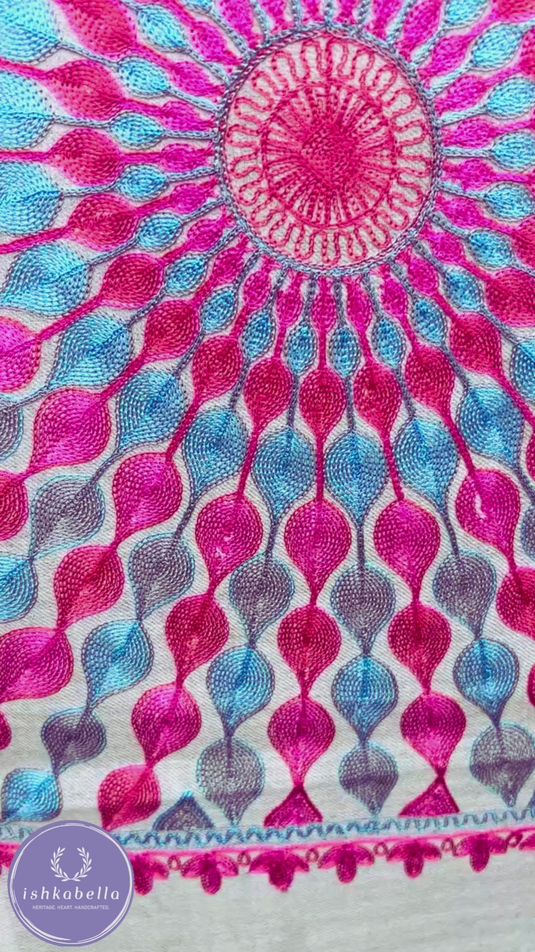 Soft and serene, this 100% Cashmere Pashmina stole in sea shell white comes alive with delicate Ari embroidery in pink and blue circular sun motifs. Each glowing element sits within teardrop shapes, symbolising radiance and renewal. The gentle interplay of colour and craft makes this stole a poetic piece of wearable art.